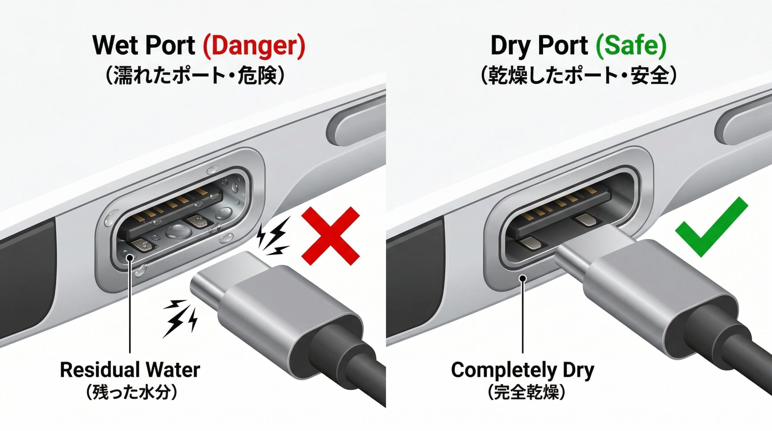 故障を防ぐ乾燥のコツ。USB-C充電ポートに残った水分とサビ・腐食の防止策
