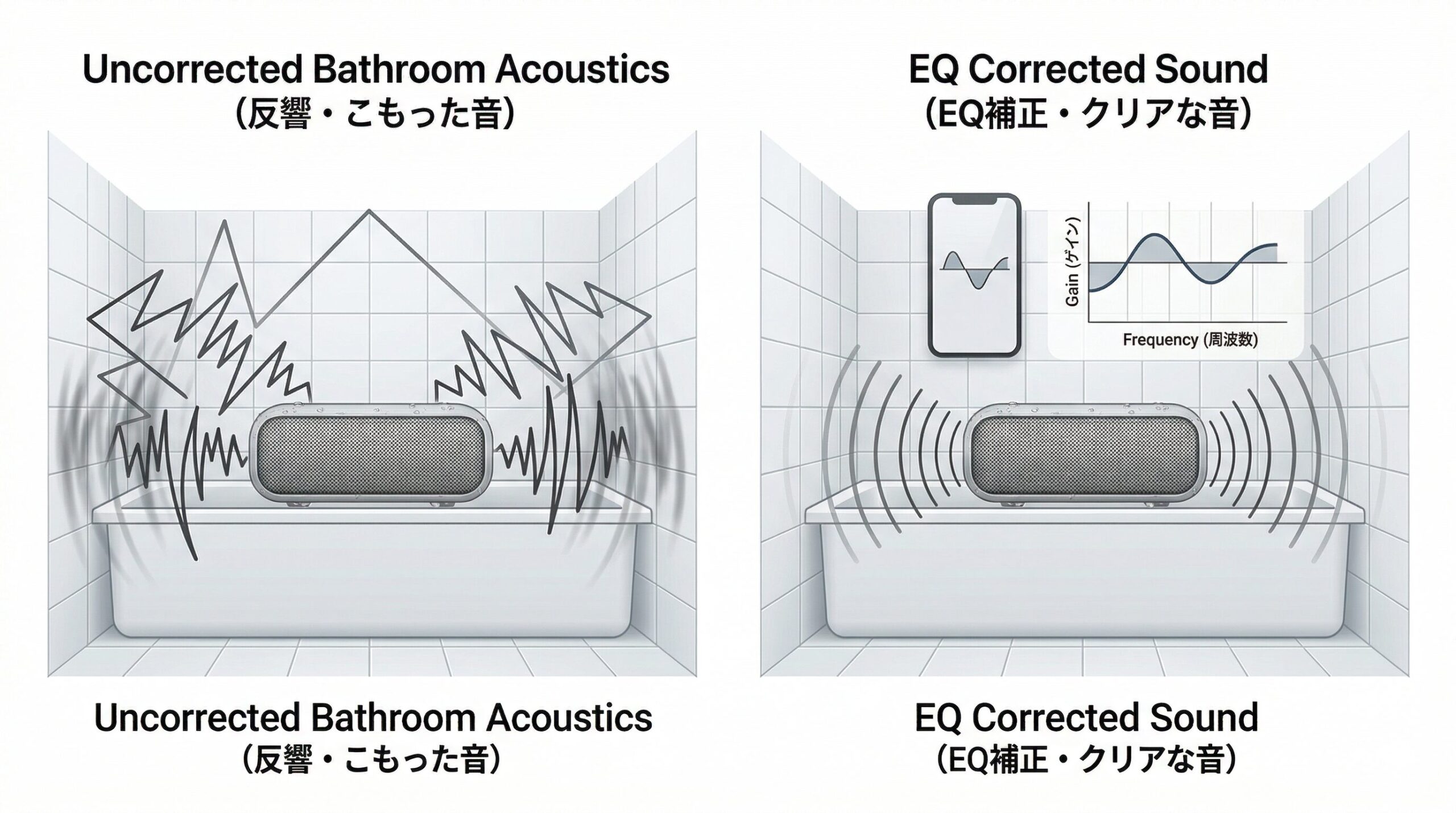 • 浴室特有の音の反響は、専用アプリのイコライザー(EQ)で補正する。
