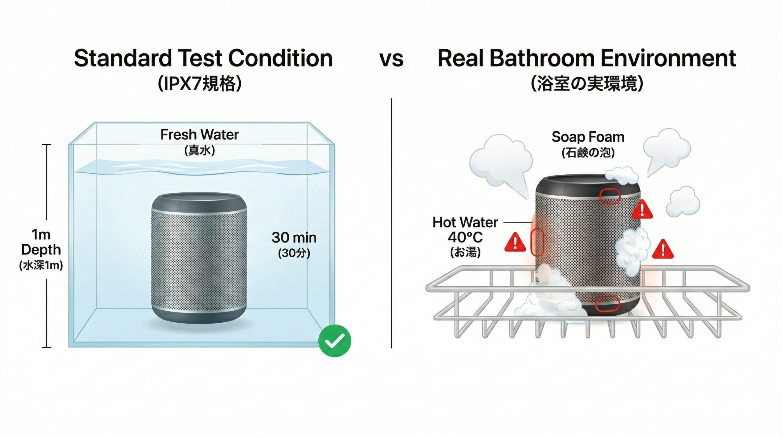 ここで重要なのは「常温の水道水」という条件です。浴室特有の40度近い「お湯」や「シャンプー・石鹸の泡」はテストの想定外であり、ゴムパッキンの劣化やスピーカーネットの目詰まりを引き起こす原因になります。
