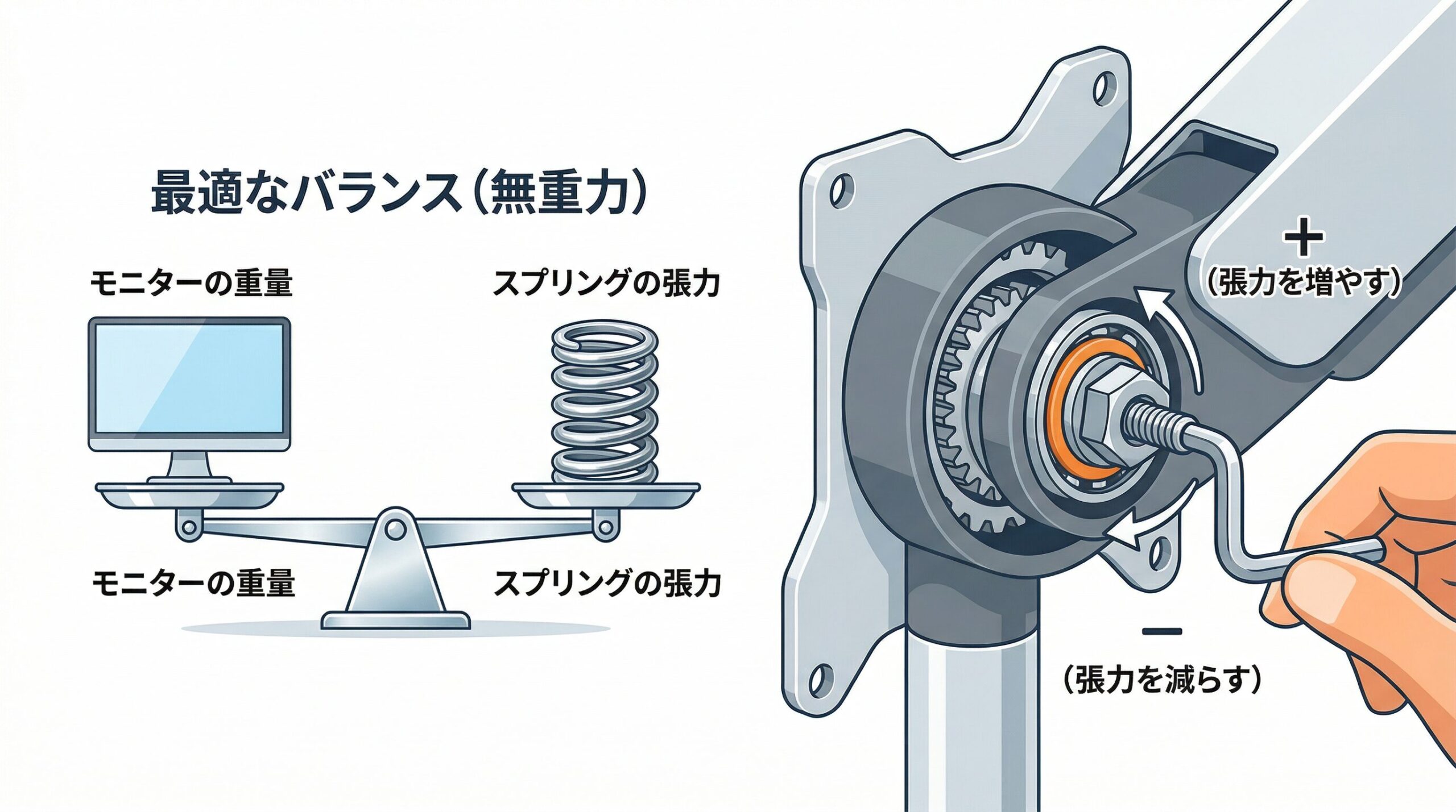 付属の六角レンチを使用し、各関節部分にある調整ネジをプラス(+)またはマイナス(-)の方向へ回すことで、指一本で動かせる無重力のような最適な操作感を手に入れることができます。