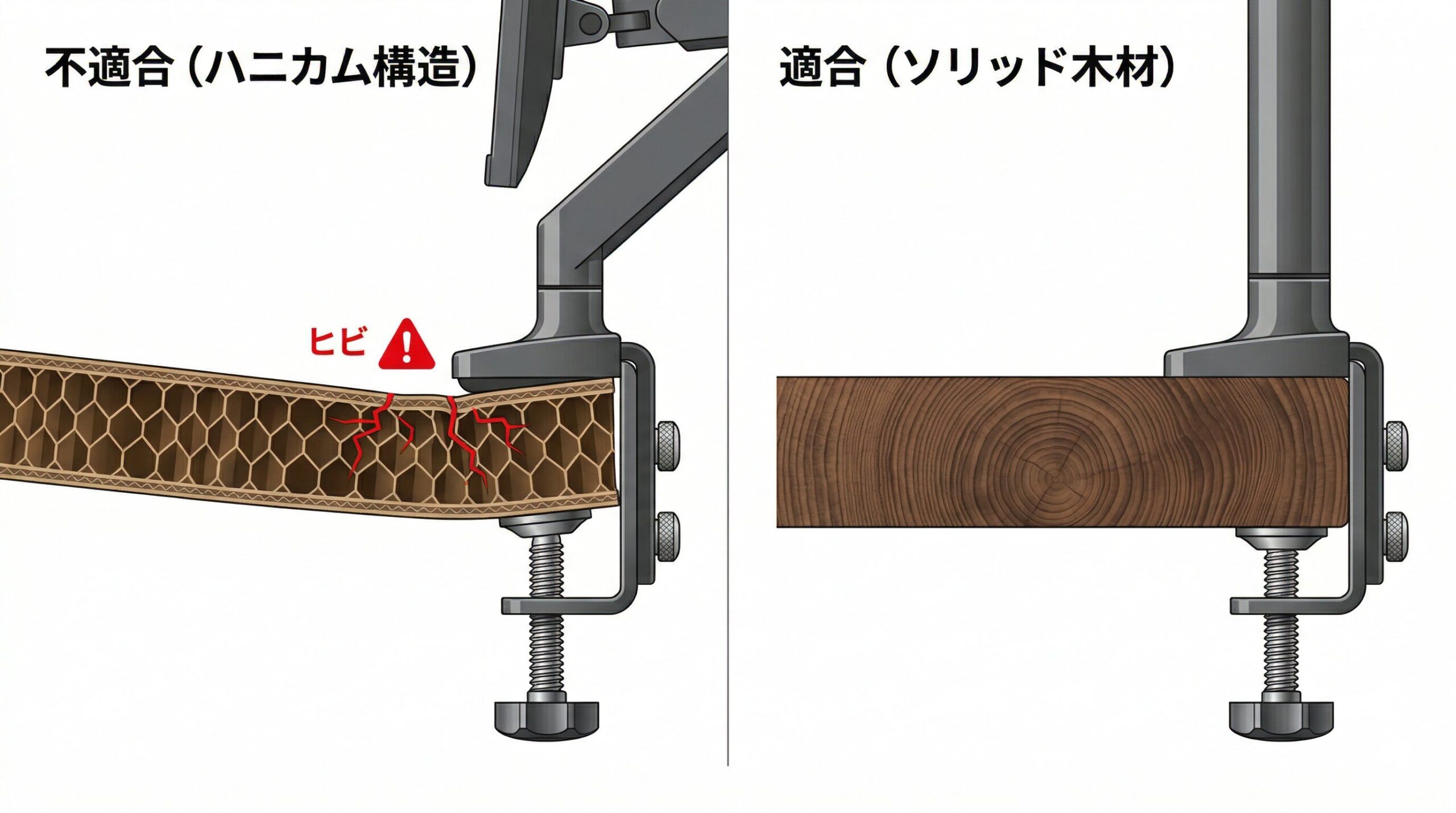 製品を導入する前に、ご自身のデスクがクランプ(挟み込み式)での固定に耐えうるかを必ず確認してください。天板の厚みが薄すぎる場合や、ガラス製のデスク、あるいは内部が空洞になっているハニカム構造の天板などは、アームの重みとテコの原理によって破損するリスクが高く、取り付けには適していません。