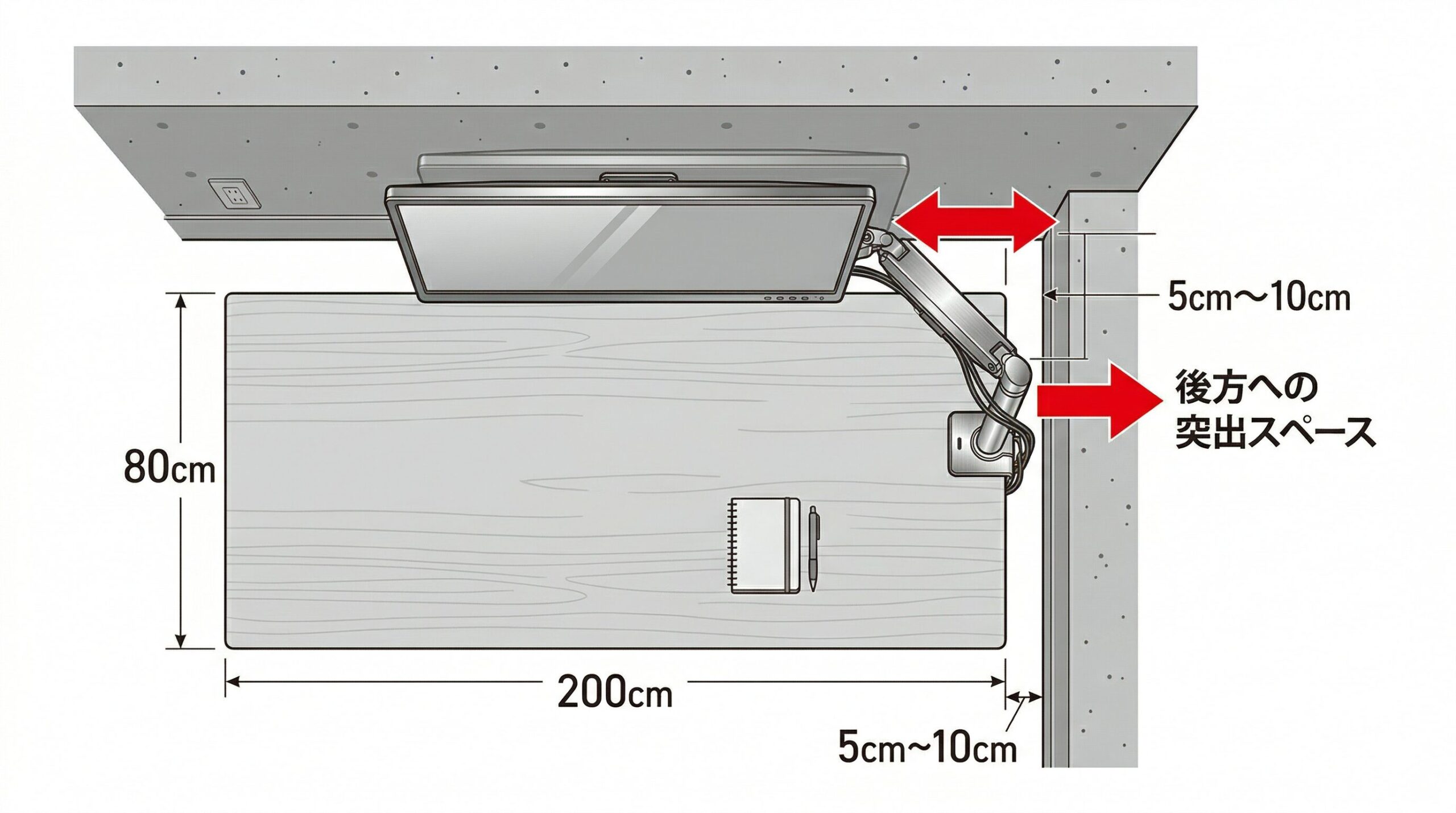 アームの関節部分が壁に干渉してしまい、結果的にデスクを前に出さざるを得ないという本末転倒な事態を防ぐには、製品ごとの構造と可動域を正確に把握しなければなりません。