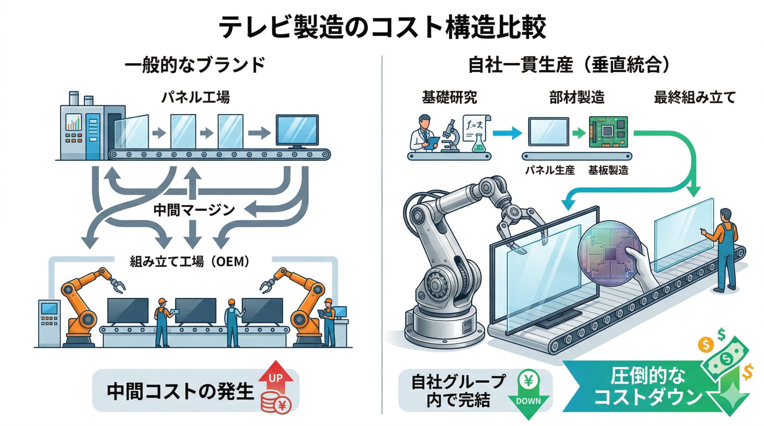 テレビの原価の大部分を占めるディスプレイパネルを自社で製造・調達できる企業は、世界でもごくわずかに限られます。国内ブランドの多くが海外メーカーからパネルを買い付けてテレビを組み立てている現状を考慮すれば、中間マージンが発生しない価格設定は、品質の妥協ではなく極めて論理的な企業努力の結果と言えます。