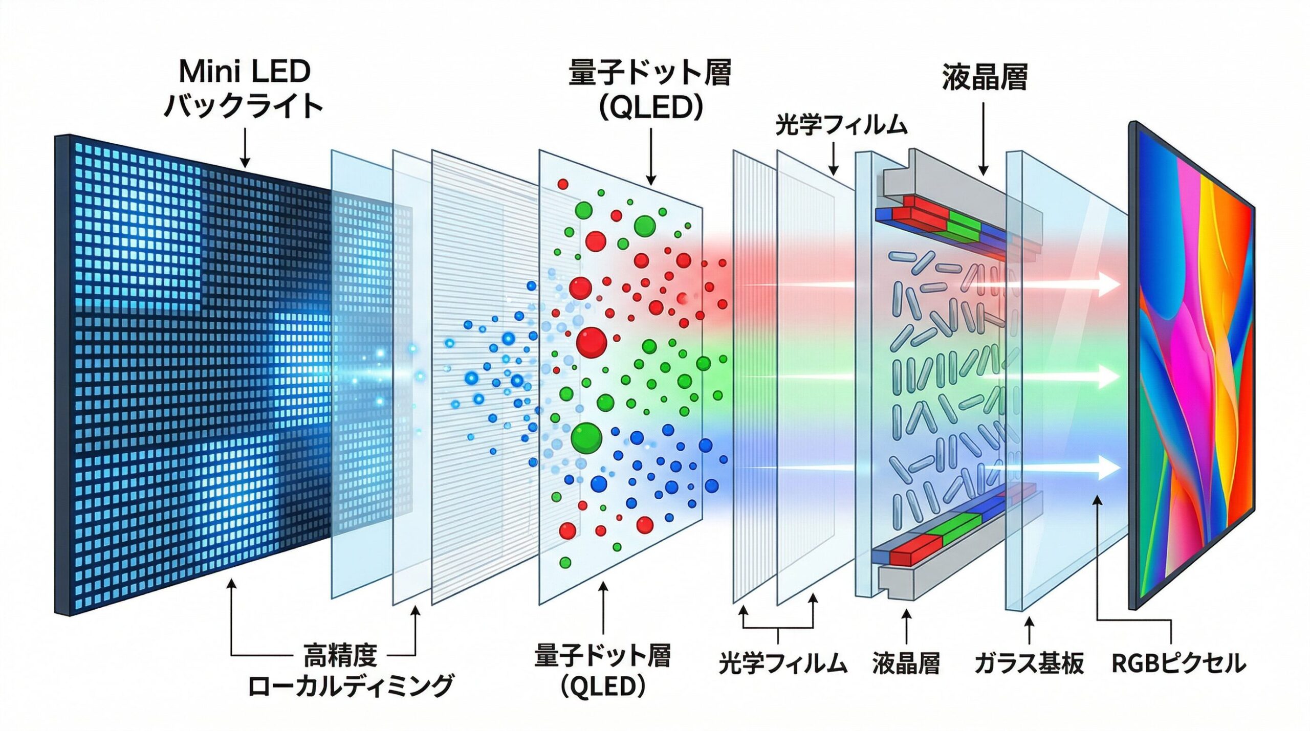 - メリット:精密なバックライト制御による黒の沈み込みと、AIによる強力なノイズ除去処理