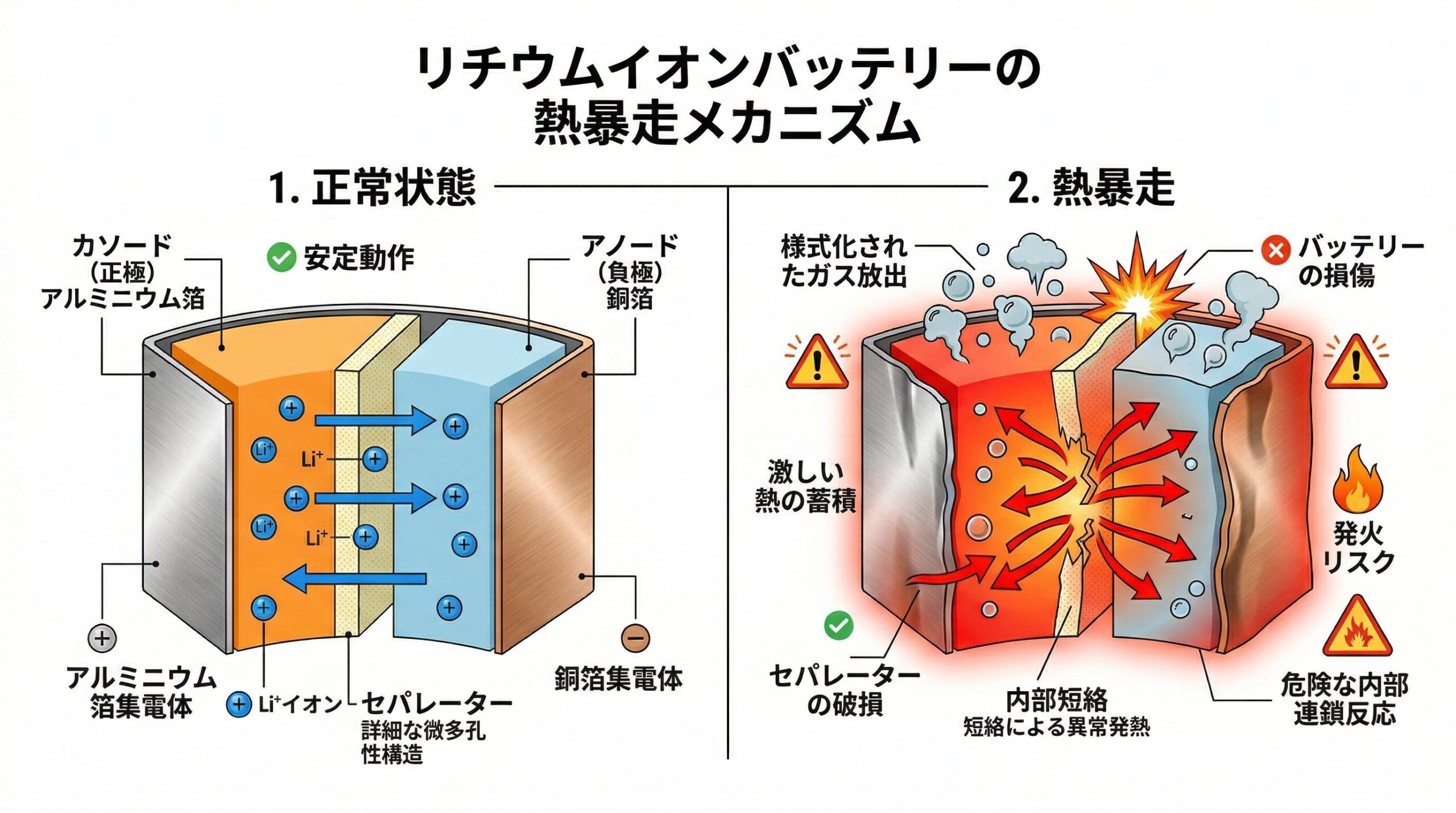 バッテリー内部が高温になると、正極と負極を隔てているセパレーターが収縮・破損し、内部ショートを引き起こします。これによりさらなる発熱が生じ、制御不能に陥って可燃性ガスが噴出し、発火・破裂に至るのが熱暴走のメカニズムです。