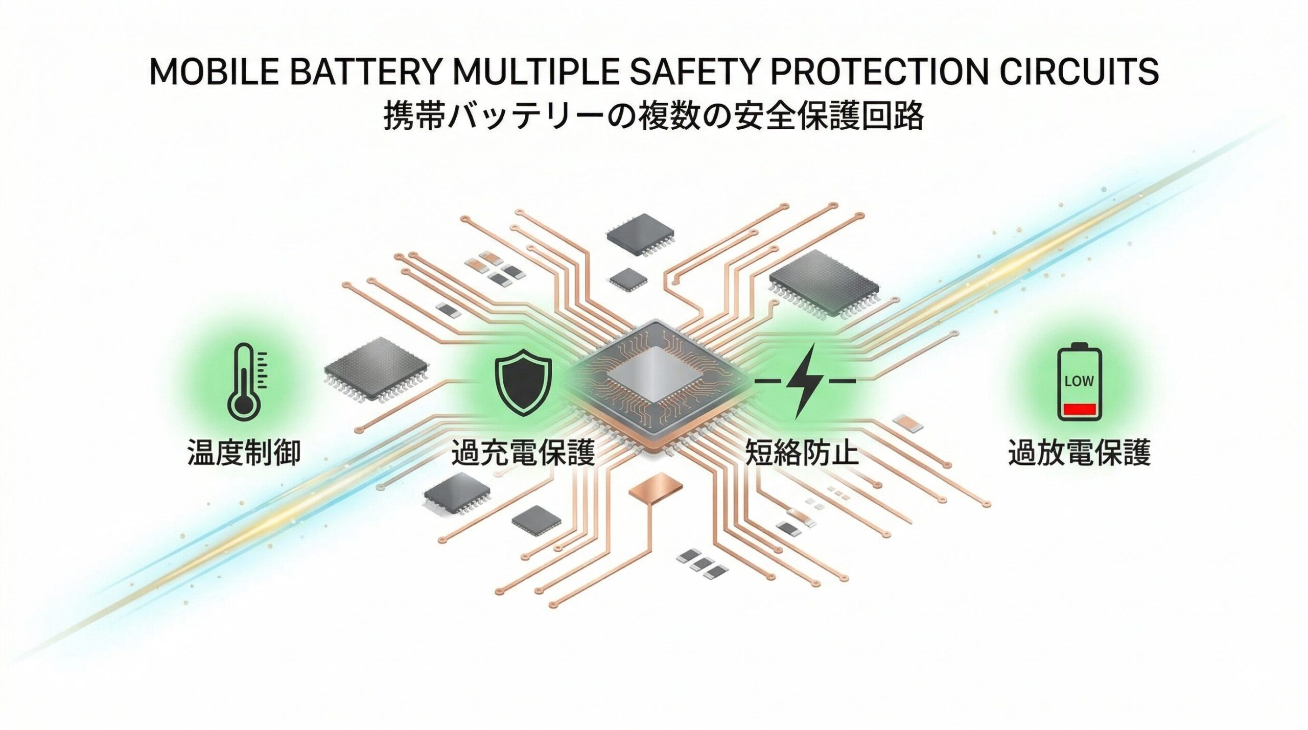 このマークは、製品が国の定める安全基準の検査をクリアした証明です。PSEマークを取得している製品は、過充電(限界を超えて充電し続けること)や過放電、ショート(短絡)が発生した際に、自動で電流を遮断する保護回路が必ず搭載されています。