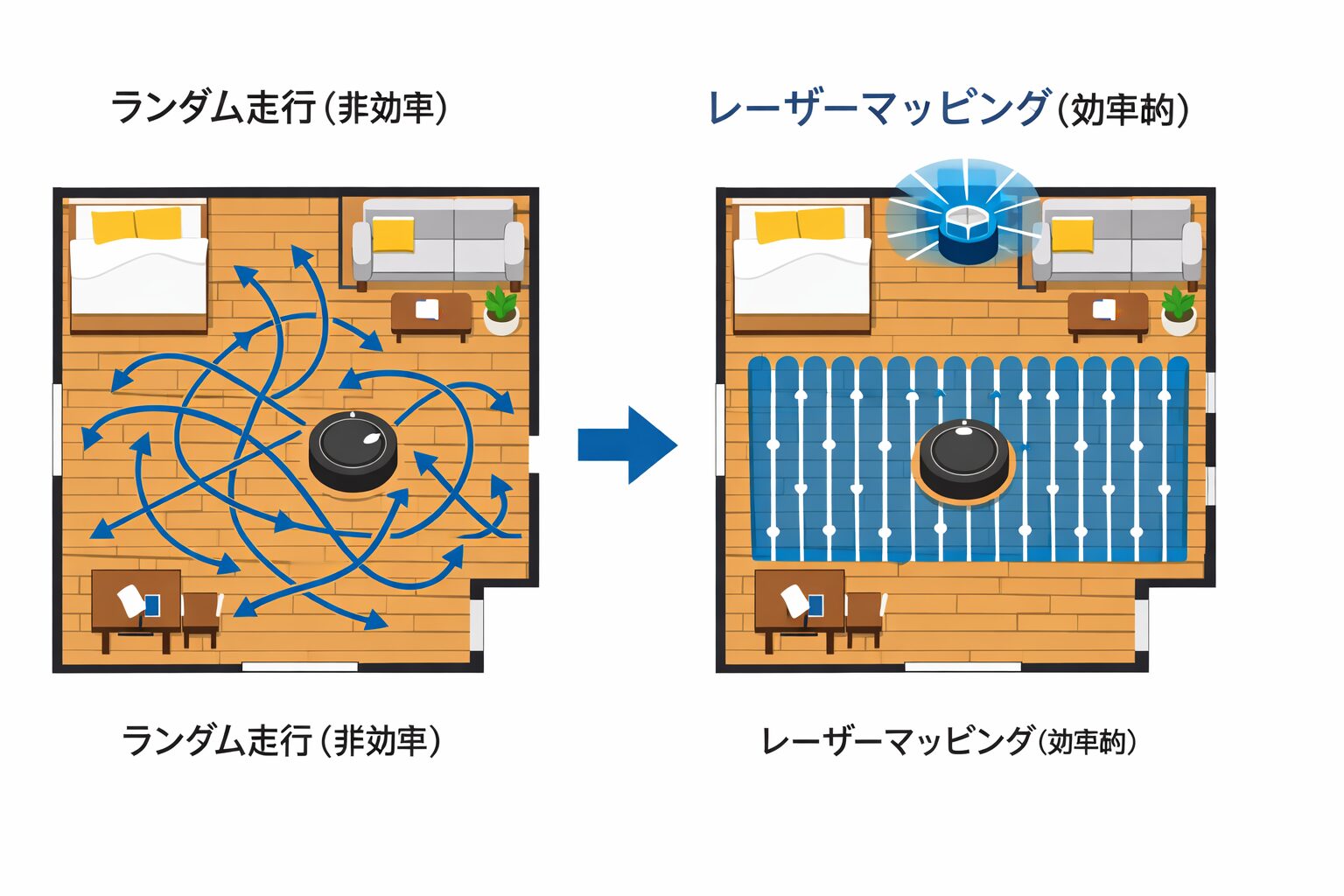 2つ目は「レーザー等によるマッピング機能」です。これがないランダム走行モデルは、同じ場所を何度も掃除する非効率な動きになり、狭い部屋でも満足な清掃結果が得られません。