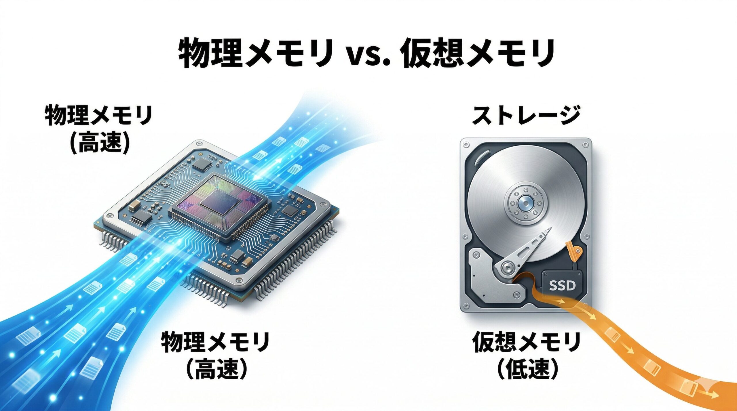 「メモリ12GB(物理4GB+仮想8GB)」といった表記を見た際、それが12GBの処理能力を持っていると誤解してはいけません。仮想メモリとは、ストレージ(ROM)の一部を一時的にメモリとして代用する機能に過ぎず、物理的なRAMチップほどの高速なデータの読み書きは不可能です。