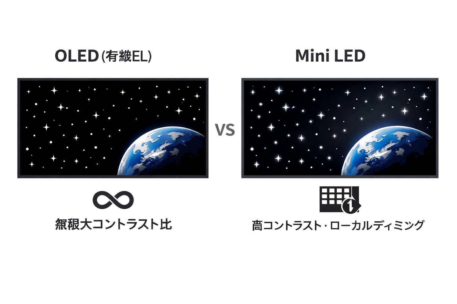 映像の立体感を生み出すコントラスト比において、両者は異なるアプローチをとります。