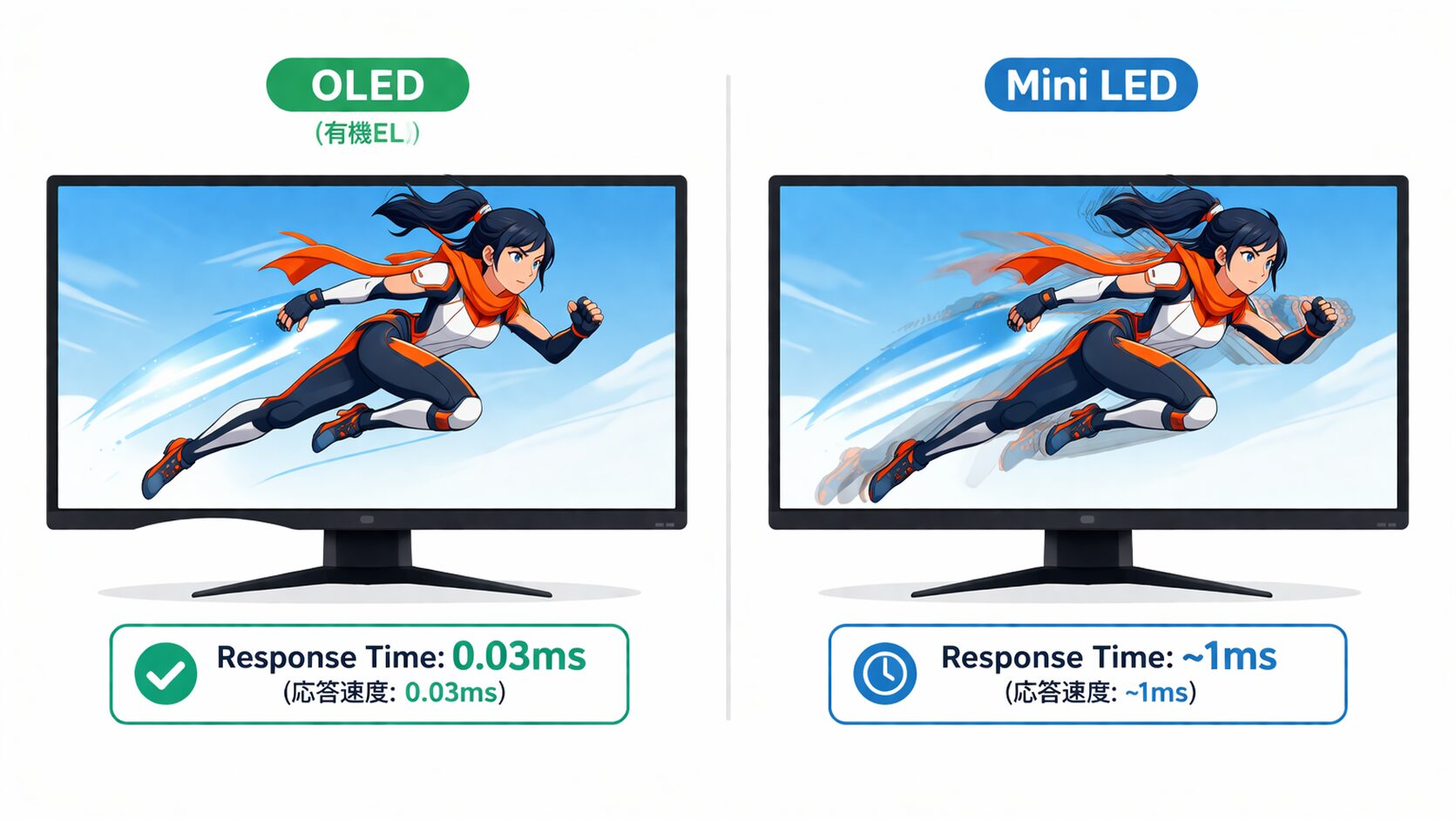 有機ELは物理的な液晶分子の回転を伴わないため、応答速度が0.03msといった異次元の速さを誇り、激しい視点移動でも残像が一切発生しません。対するミニLED(液晶ベース)の応答速度は1ms前後となりますが、静止したUI(体力ゲージなど)を長時間表示し続けるゲームにおいても、焼き付きの物理的リスクが皆無であるという絶大な安心感を提供します。