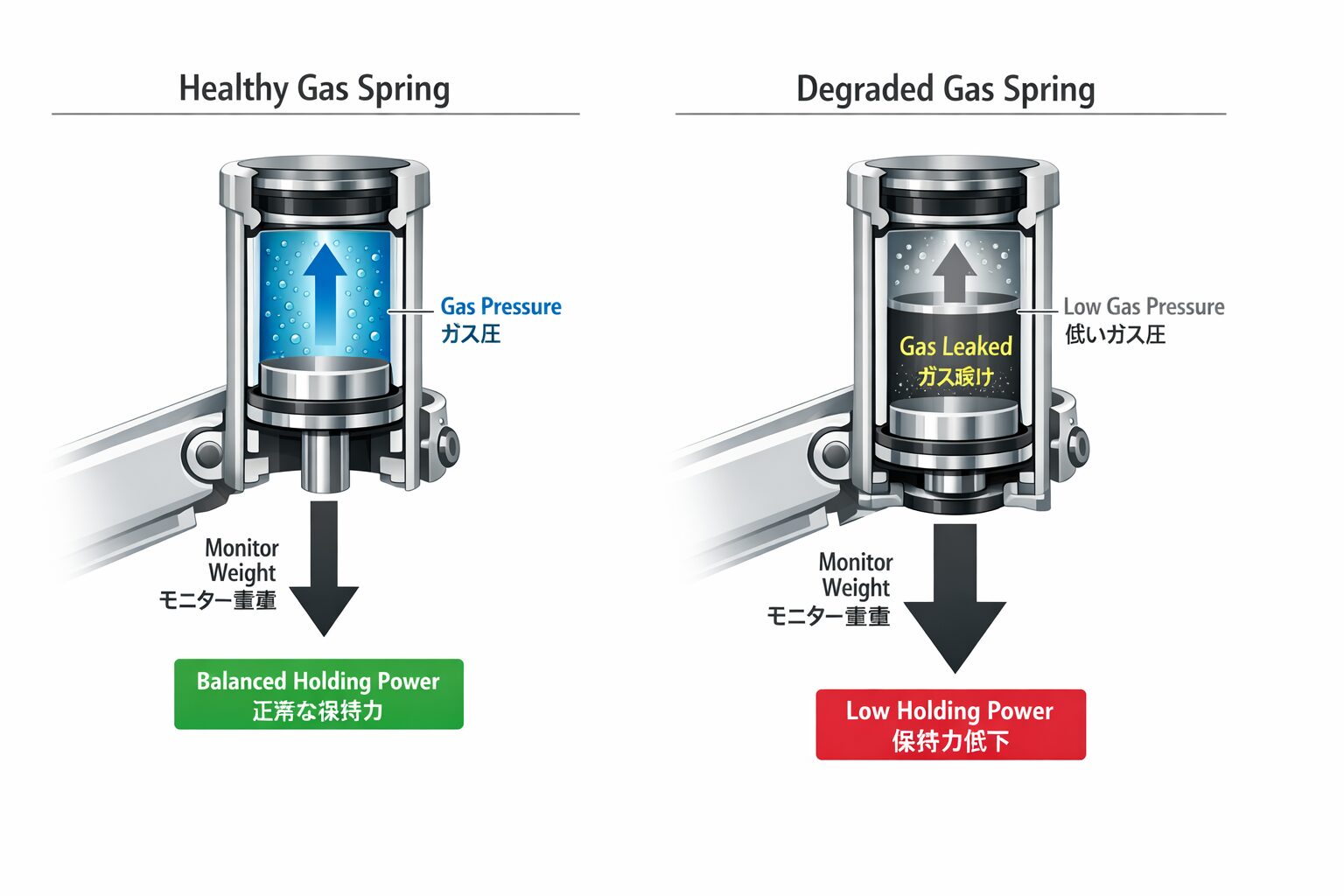ガススプリング式の「寿命」と「保持力」。大型モニターほどメーカーの信頼性が重要になる理由