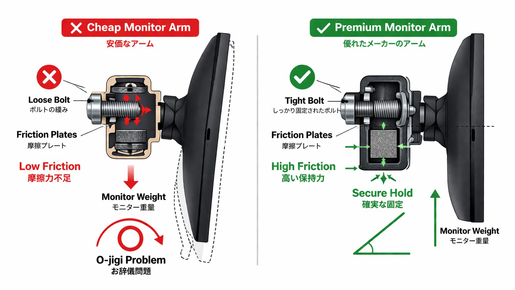 優れたメーカーの製品は、一度ボルトを適切に締め付ければ、モニターの角度をピタリと固定したまま微動だにしません。