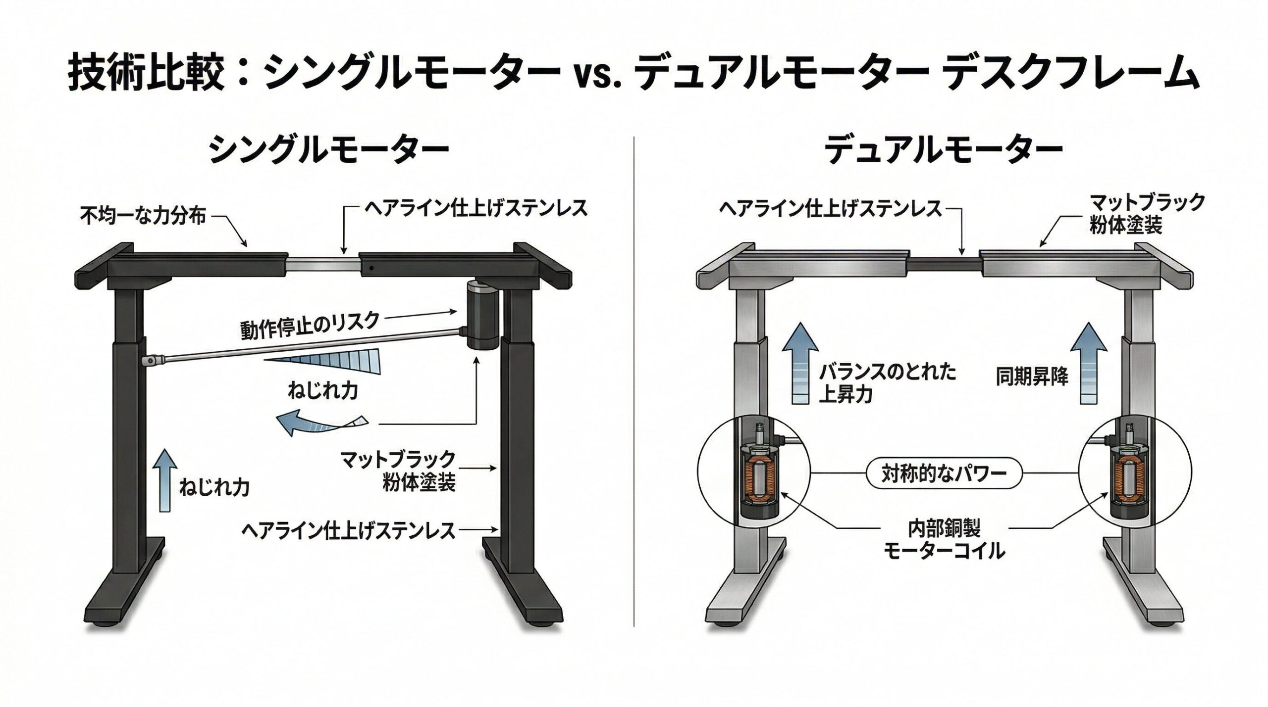 デュアルモーターかシングルか。昇降スピードと耐荷重(kg)から見る安定性とメンテナンス性の差