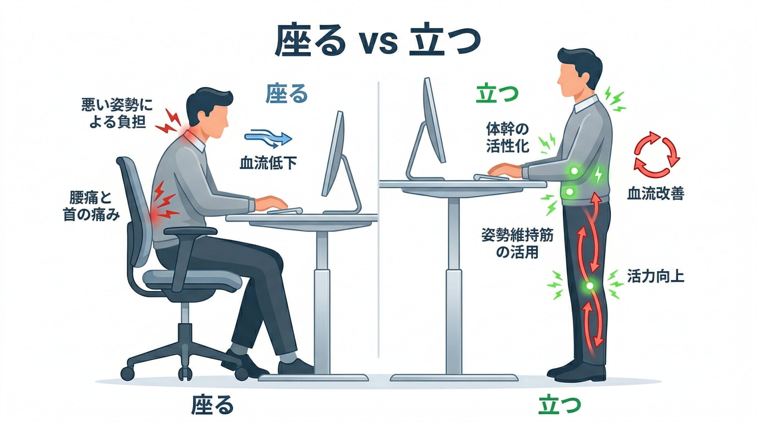 座りっぱなしの姿勢は血流を滞らせ、集中力の低下だけでなく長期的な健康リスクも招きます。そこで注目されるのが、立つ・座るの姿勢を自由に変えられる「昇降デスク」です。