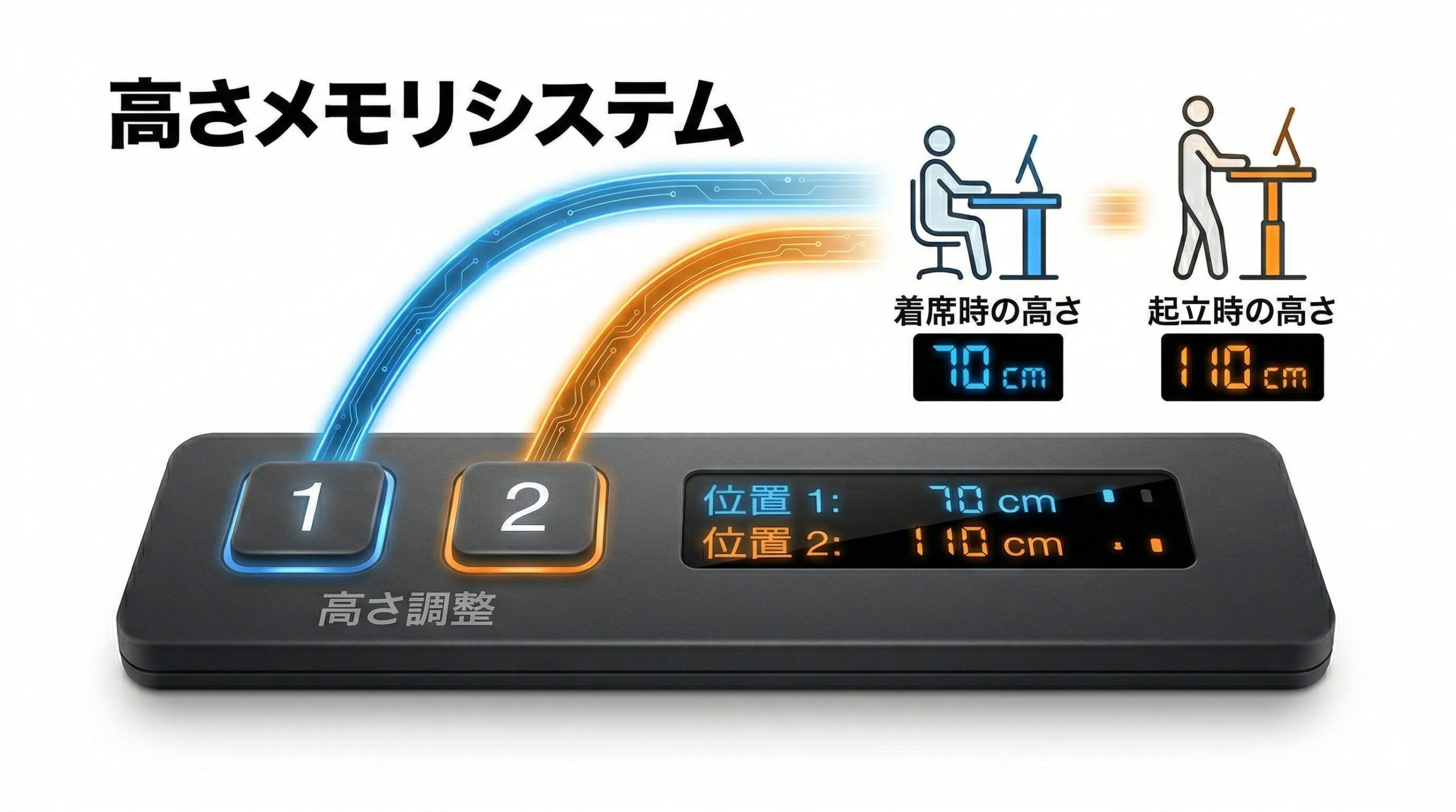 - ✓「メモリ機能のおかげで、ワンタッチでいつもの高さに戻せて超便利」毎回高さを微調整する手間がなく、ボタン一つで好みのポジションに自動で動く。