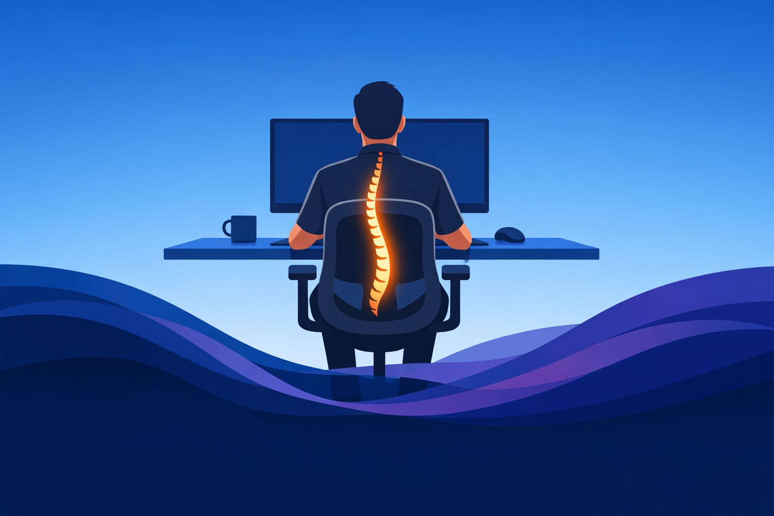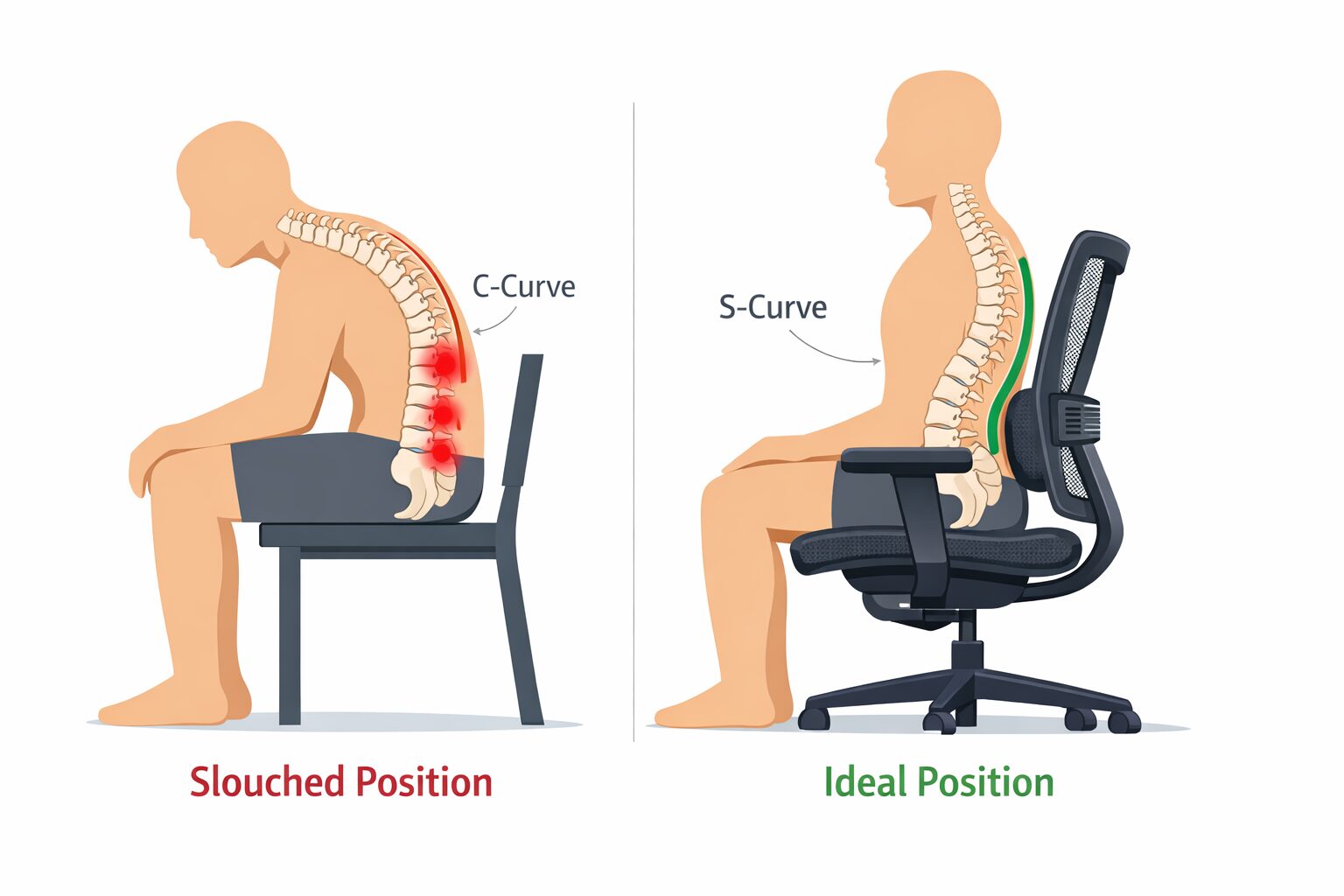 長時間の着座において、人間の背骨は本来のS字カーブを失い、C字に丸まりがちです。これが腰痛の根本的な原因となります。
