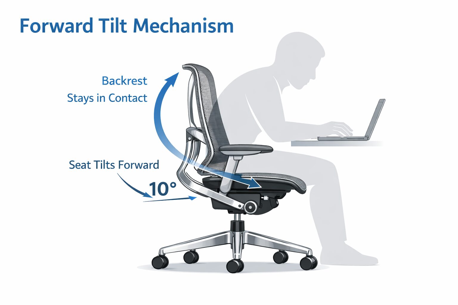 一般的な椅子で前傾になると背もたれから背中が離れてしまいますが、「前傾チルト機能」を搭載した椅子(シルフィーなど)は、座面と背もたれが一緒に前に傾き、前のめりの状態でも腰を的確にサポートします。
