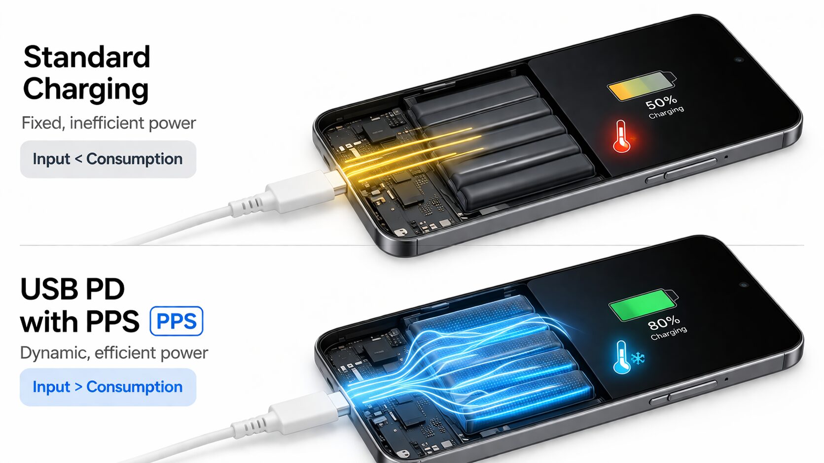 さらに踏み込むなら、PDの拡張機能である「PPS(Programmable Power Supply)」に対応したモデル(CIOの一部モデルなど)を選ぶべきです。PPSは、スマートフォンのバッテリー残量や温度に合わせて、電圧と電流をリアルタイムかつ小刻みに最適化します。