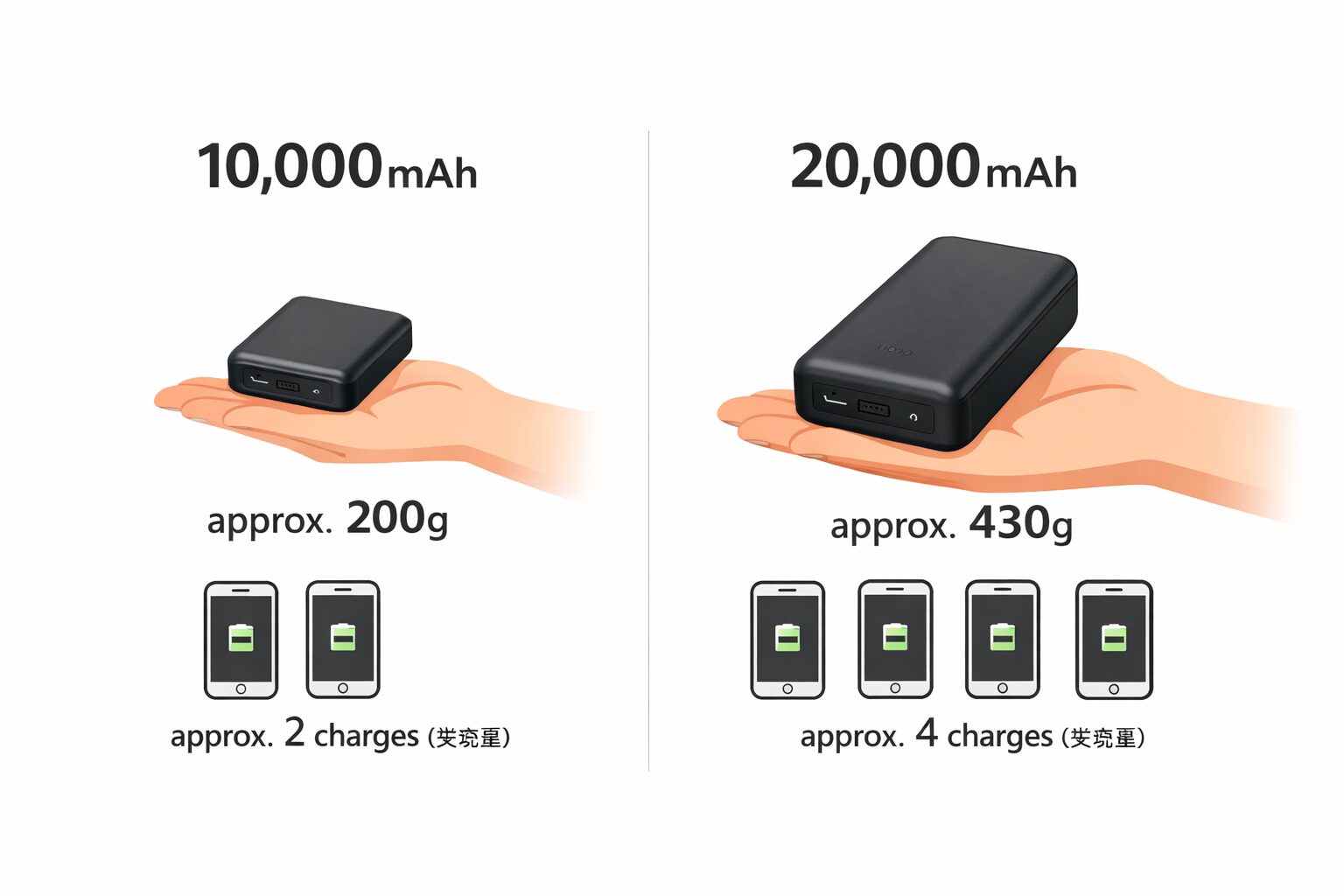 つまり、10,000mAhであればスマホ約2回分、20,000mAhであれば約4〜5回分が目安です。1日の外出であれば約200gの10,000mAhが携帯性の限界値であり、20,000mAh(約400g超)は長期間の旅行や災害用と割り切るのが、カバンを重くしないための鉄則です。