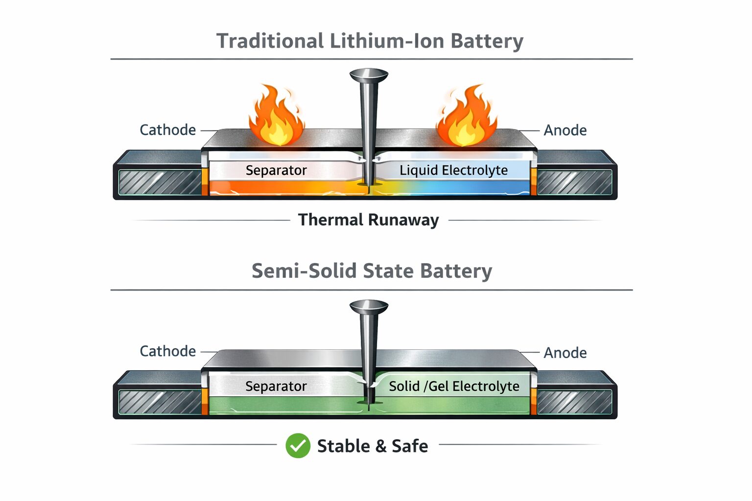 内部の電解液をゲル状または半固体化することで、万が一の落下や衝撃で外装が破損しても、液漏れや発火が起こりにくいという圧倒的な安全性を誇ります。