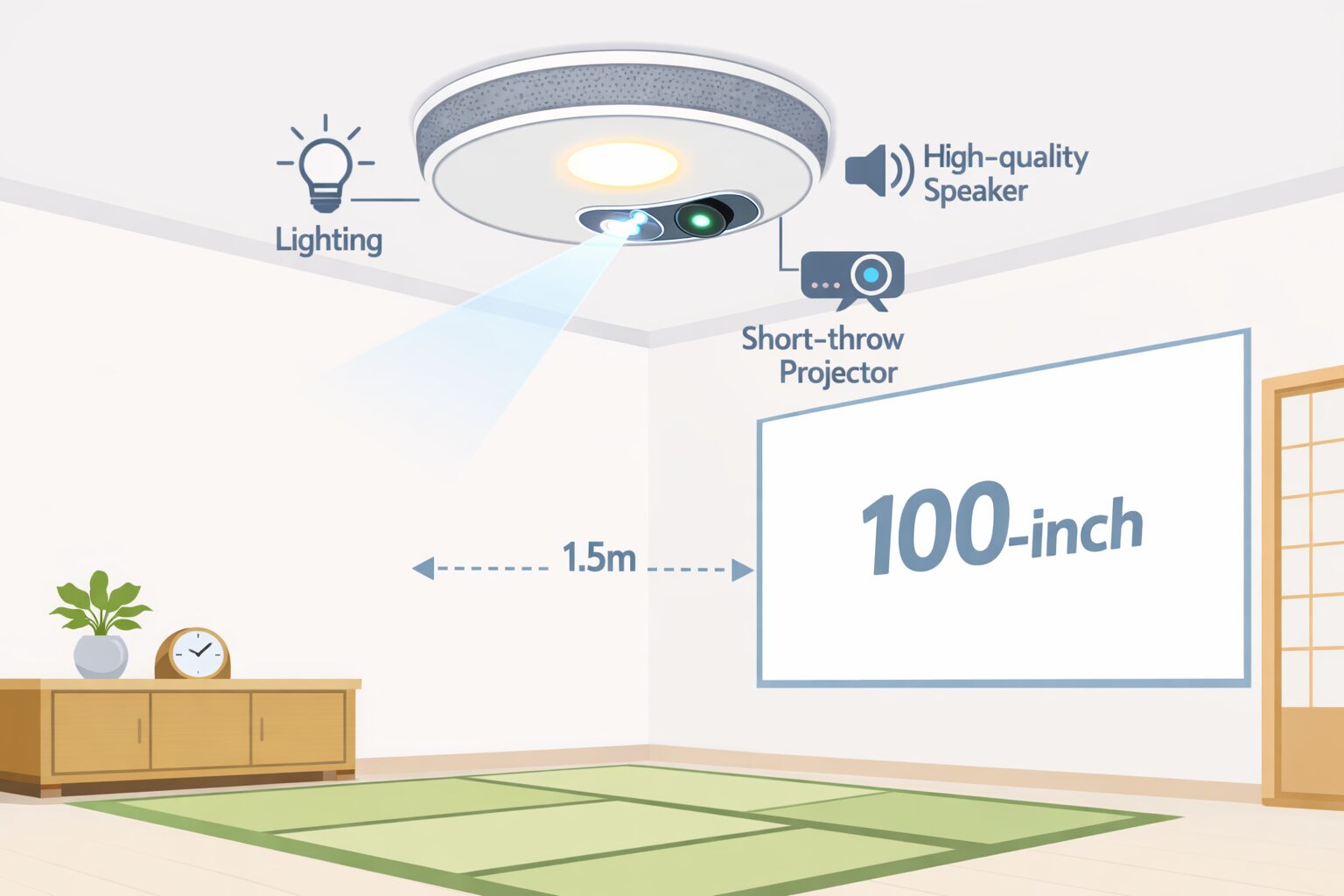天井の照明用シーリングソケットに取り付けるだけで、プロジェクター、高音質スピーカー、LED照明の3つの役割を完結させます。独自の短焦点レンズを採用しているため、壁までの距離が短い6畳間でも、大画面(壁から1.5mで約100インチ)の投写が可能です。床にケーブルが這うという物理的なノイズを完全に排除できます。