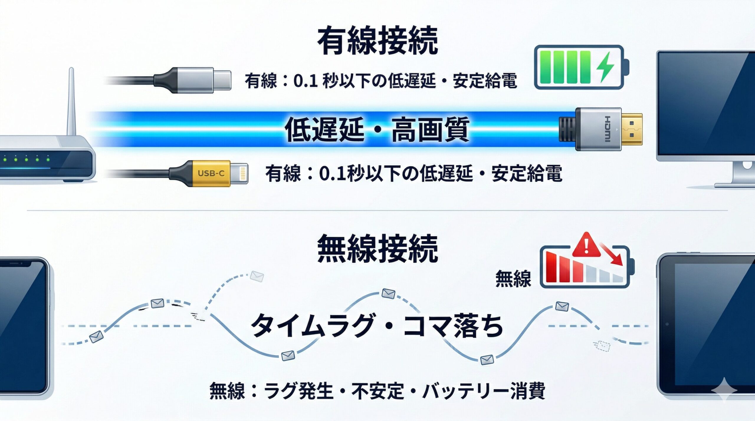 無線でのサブモニター化はケーブルレスの快適さをもたらしますが、ネットワーク環境に依存するため映像のコマ落ちやラグが避けられません。一方で有線環境は、安定した電源供給と広大な通信帯域を確保できるため、長時間の過酷な作業においても高いパフォーマンスを維持し続けます。