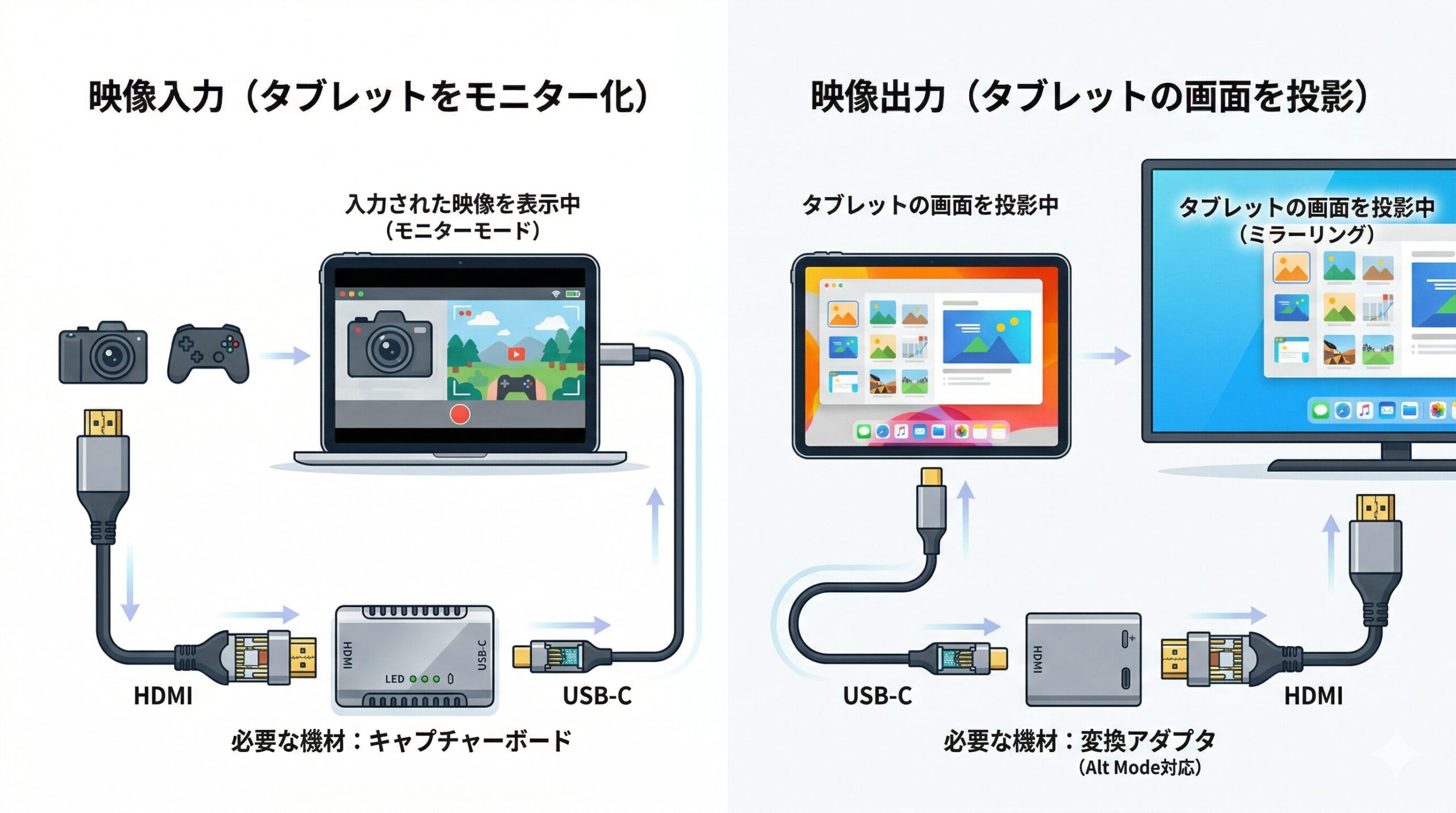 受信(モニター化)にはキャプチャーボードが、送信(外部出力)には変換アダプタが必要になるという違いを明確に把握しておきましょう。