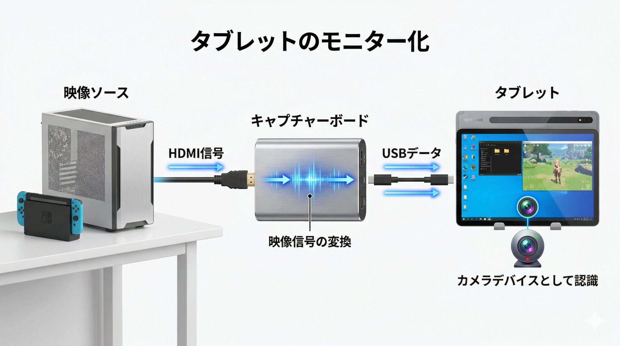 PCやゲーム機から出力されるHDMIの映像信号は、そのままではモバイル端末のディスプレイに映し出すことはできません。キャプチャーボードと呼ばれる中継機を使用し、映像をUSBデータに変換して端末へ送り込むプロセスが必要となります。